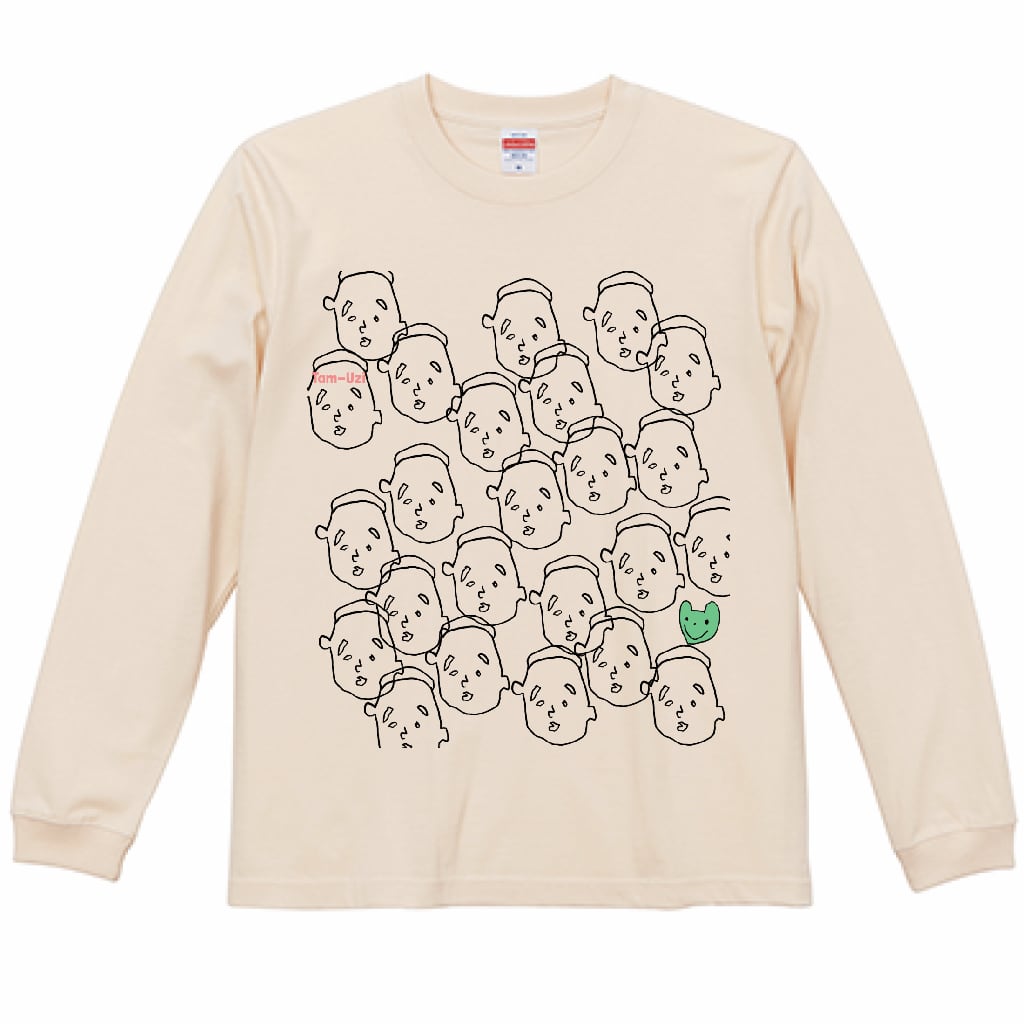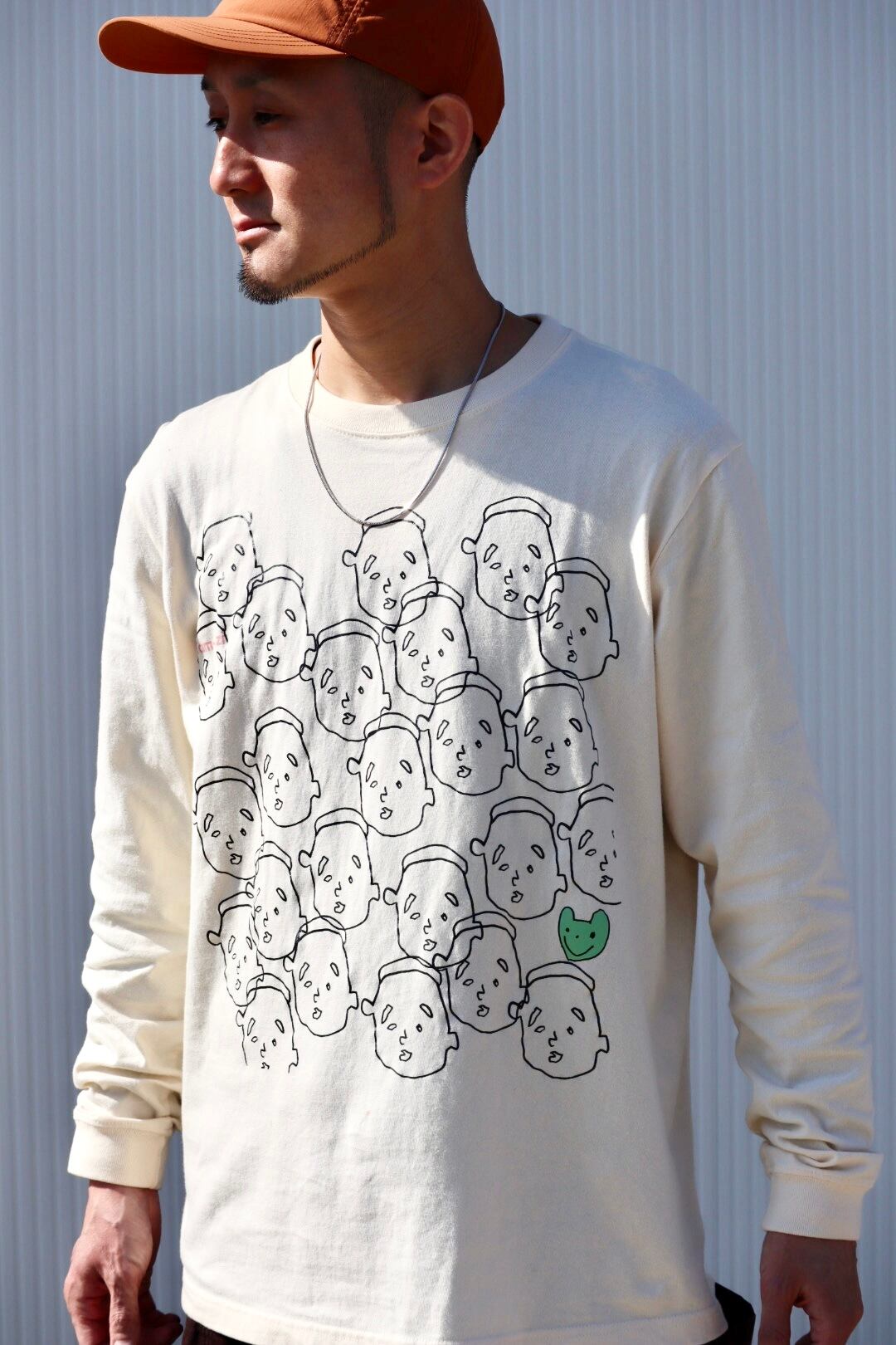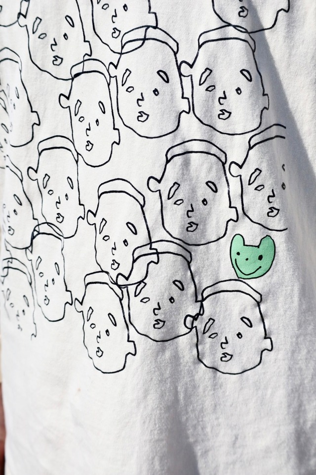 ユーモラスな手描きの表情が並ぶ、着る人も見る人も思わず笑顔になる一枚です。